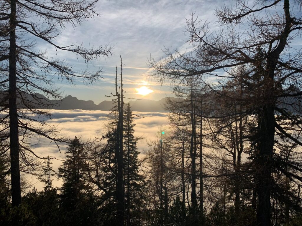 Talán tíz percet kapunk ebből a csodából odafent, 1650 méteren, vakító, mindent átfényesítő, ragyogtató formában, mielőtt a következő felhőréteg az esti szürkülettel együtt aznapra végleg beborítja a hegycsúcsot, és vele együtt bennünket is.