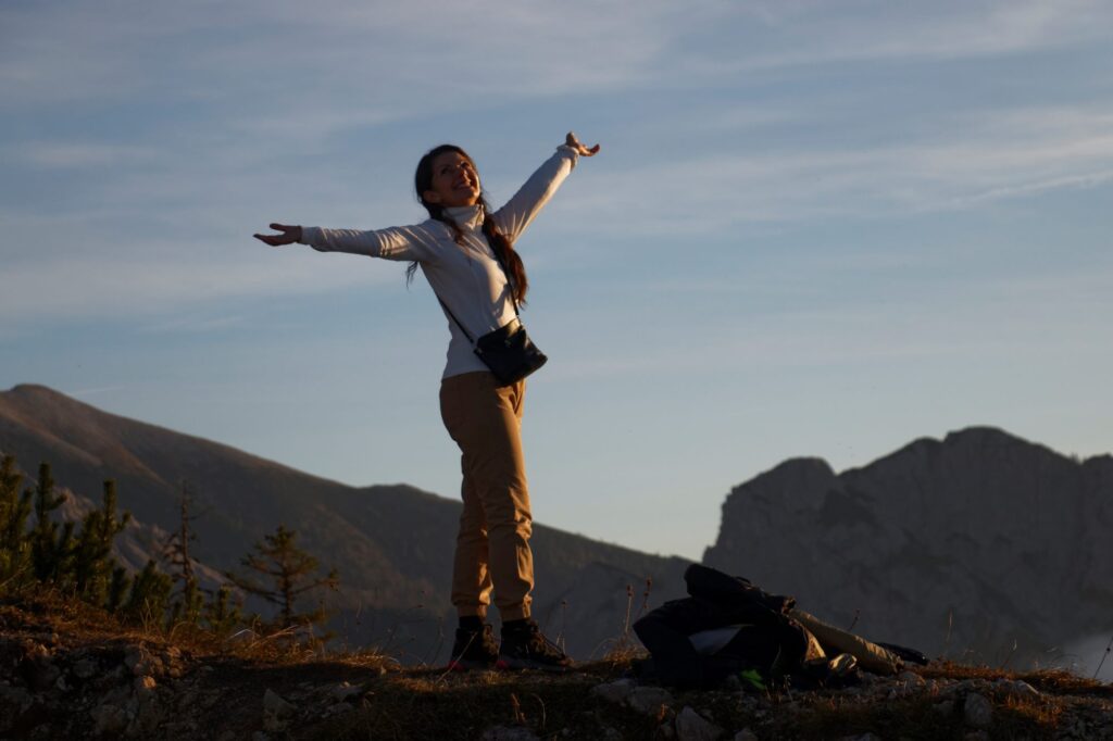 Mosollyal az arcunkon, sietősen jövünk lefelé a hegyről. Nincs más itt rajtunk kívül – csak most tudatosodik, hogy valószínűleg mi vagyunk az utolsók, akik aznap délután megmászták a hegyet, és valóban, az elmúlt másfél órában minden turista szembe jött velünk.